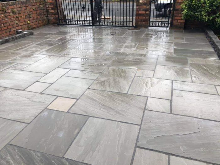 Driveway Kandla Grey Sandstone driveway 30mm is a riven. Kandla Grey Sandstone 30 mm Mixed Sizes Machine Cut – It is a beautiful grey sandstone that originates from India from a place called as Kandla, hence popularly known as Kandla Grey or even Promenade as it gives that very warm Promenade look on a sunny morning. It really stands out as a very unique colour after it is laid. It originates from India. It undergoes a Machine technique which is a process of Calibration which gives a line finish on bottom of stone to even out thickness of slabs to 30mm with hand-cut edges. Our Natural Stone is high quality for your Driveways, Patios, Garden Paving and Landscaping Projects from Direct Importers. All our products are suitable for British Weather conditions, and they are frost resistant.