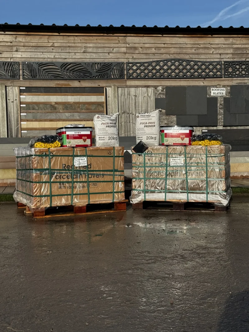 56.16m² of eco porcelain paving of your choosing, 2 x Rompox Porcelain Jointing Compound (25kg), 2 x Fuga Pave Slurry Primer, 2 x 5mm Spacer Sets and 1 x 4″ Porcelain Blade