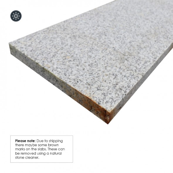 A very unique colour of silver in granite with flaming texture on top in single size 900×200. Natural black, silver and white dots are formed from the flaming which blend in beautifully to make it even more appealing. The colours are only a reference and because of the nature of natural stone, there may be slight colour variation with tones and patterns.